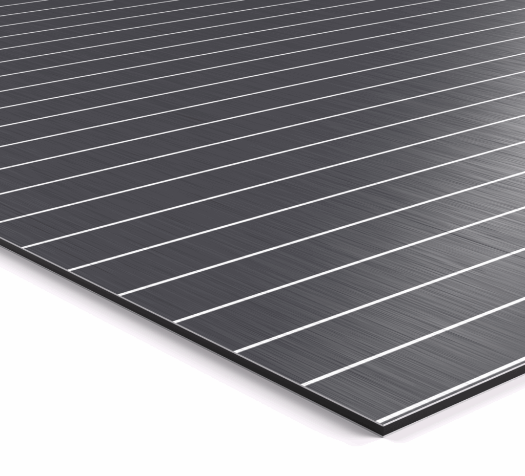 Robuste 3 mm dicke Aluverbundplatte mit Haptik durch eine gebürstete Oberfläche.